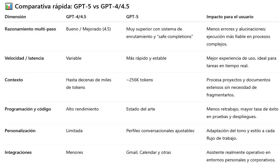GPT-5 consolida una experiencia unificada, con razonamiento superior y menor fricción operativa. Para quienes vienen de GPT-4/4.5, el cambio no es solo de precisión: es un rediseño del flujo de trabajo (menos pasos, más contexto, más automatización). Las organizaciones que re-evalúen prompts, integren correo/calendario y midan ROI por caso de uso capturarán la ventaja más rápido.